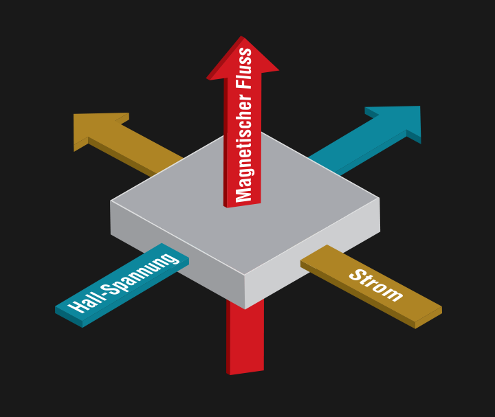 Der Hall-Effekt beschreibt das Auftreten einer elektrischen Spannung in einem stromdurchflossenen Leiter, der sich in einem (stationären) Magnetfeld befindet. Die Spannung fällt senkrecht sowohl zur Stromfluss- als auch zur Magnetfeldrichtung am Leiter ab.